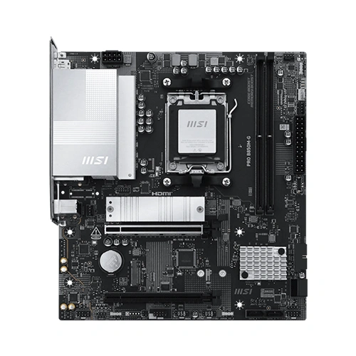PRO B850M-G offers a simple design with a harmonious silver color scheme that perfectly matches both white and black PC builds. It is engineered with many exclusive features of MSI, 5G LAN, PCIe 5.0 M.2 with M.2 Shield Frozr, and EZ PCIe Clip II, ready for the AMD Ryzen 9000 series processors.